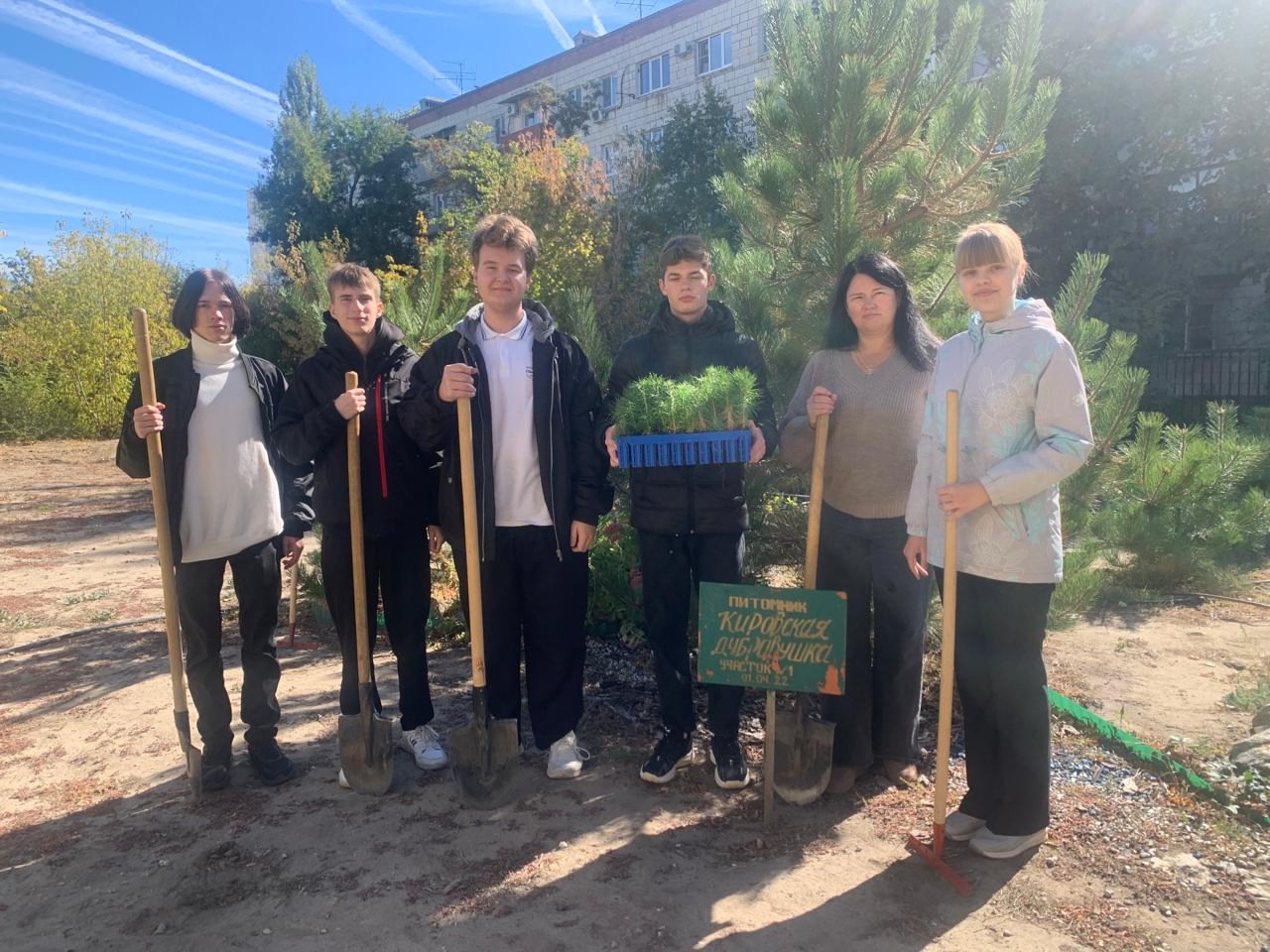 Катонина Надежда, Шамаев Андрей, Ганагин Денис, Ивахненко Владислав, Шаламов Роман вместе с классным руководителем Гобуновой А.В. и руководителем музея «Слава Халхин-Гола и Сталинградской битвы» Дементьевой О.М., высадили 100 молодых сеянцев сосны.